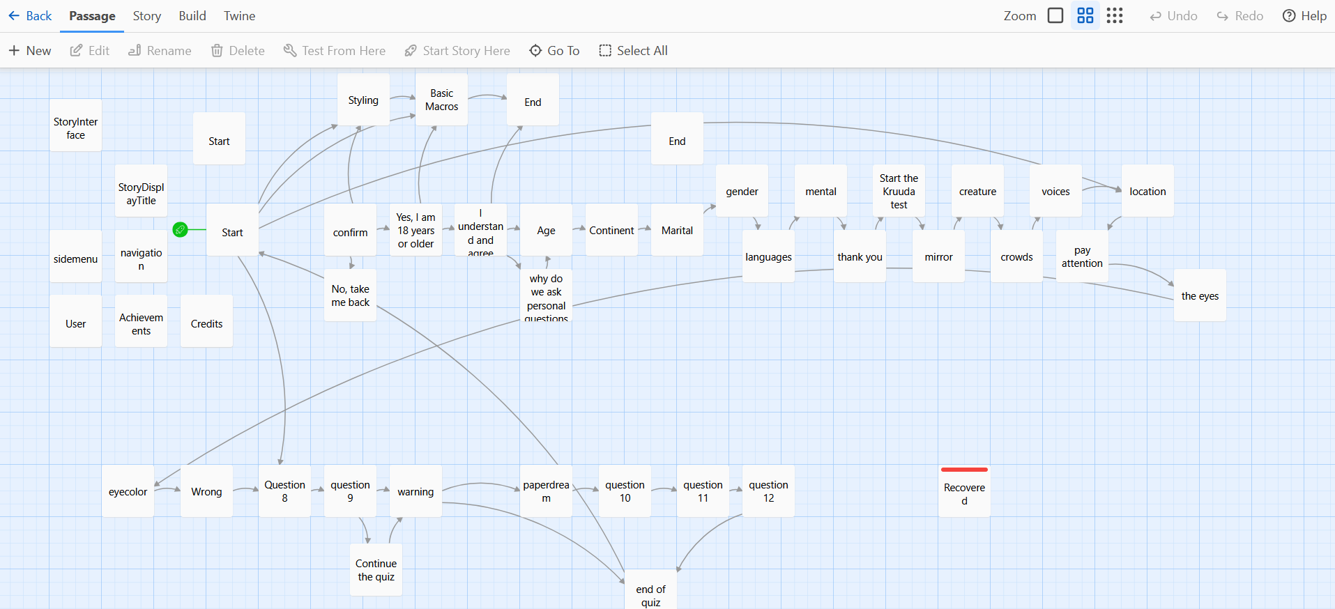 Through the website, the player could take something called the "Kruuda test" (as described in the infomercial). By using hints found in the images and on the website, players are able to enter hidden databases if they entered the right information at the right places. Desmond and I made the puzzle walkthrough together; Desmond then made visual work to support the puzzles & hints the player needed to discover as I focused on making the quiz. I used Twine 2.0 to make the quiz, which was also a very fun and useful experience.